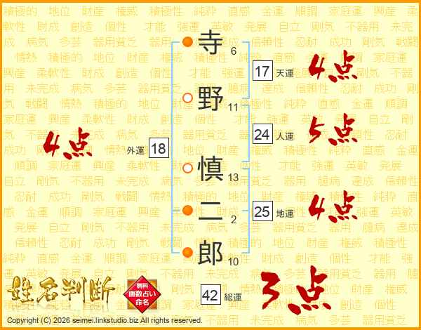 寺(6画)野(11画) 慎(13画)二(2画)郎(10画)
