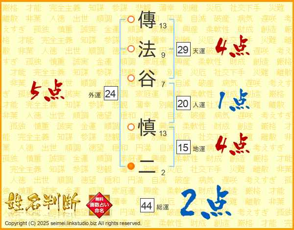 生活面を象徴する運勢です。外部から受ける影響力を表し、結婚運、家庭運や職場、環境への順応性を表します。総運から人運を引いた画数。姓や名が1文字の場合を除く。