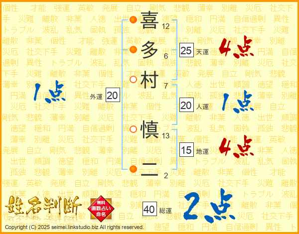 喜(12画)多(6画)村(7画) 慎(13画)二(2画)