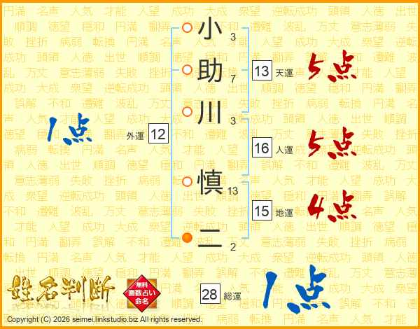 小(3画)助(7画)川(3画) 慎(13画)二(2画)