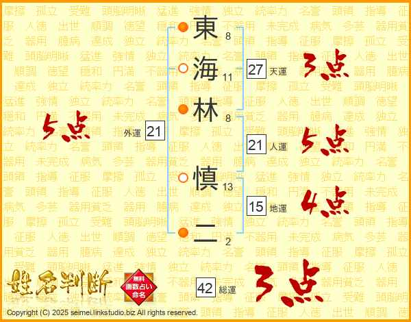東(8画)海(11画)林(8画) 慎(13画)二(2画)