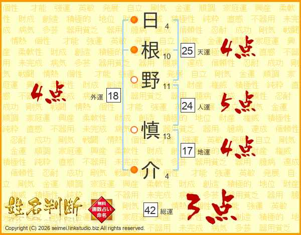日(4画)根(10画)野(11画) 慎(13画)介(4画)
