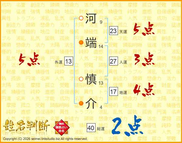 生活面を象徴する運勢です。外部から受ける影響力を表し、結婚運、家庭運や職場、環境への順応性を表します。総運から人運を引いた画数。姓や名が1文字の場合を除く。