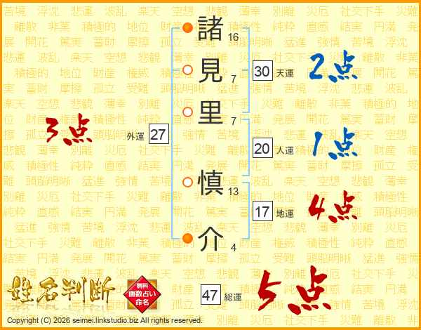 諸(16画)見(7画)里(7画) 慎(13画)介(4画)
