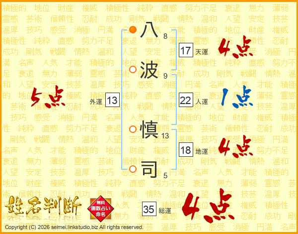 生活面を象徴する運勢です。外部から受ける影響力を表し、結婚運、家庭運や職場、環境への順応性を表します。総運から人運を引いた画数。姓や名が1文字の場合を除く。