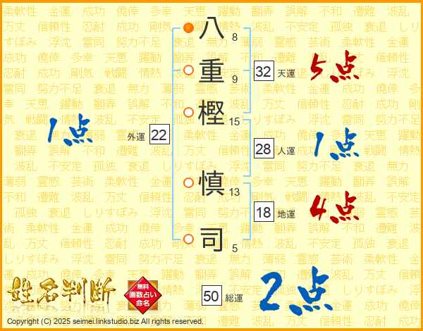 八(8画)重(9画)樫(15画) 慎(13画)司(5画)
