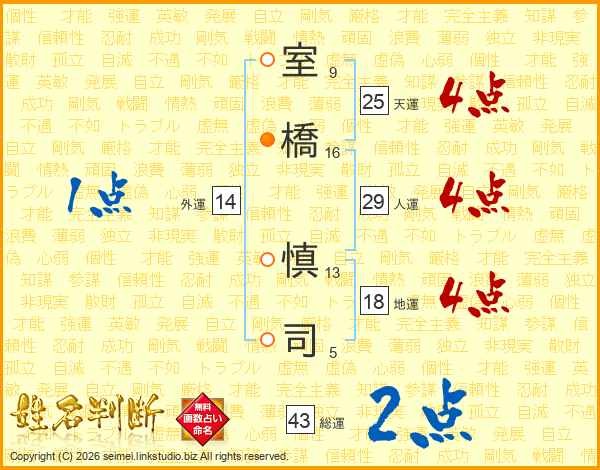 室(9画)橋(16画) 慎(13画)司(5画)