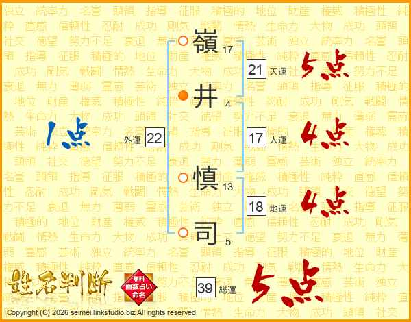 嶺(17画)井(4画) 慎(13画)司(5画)