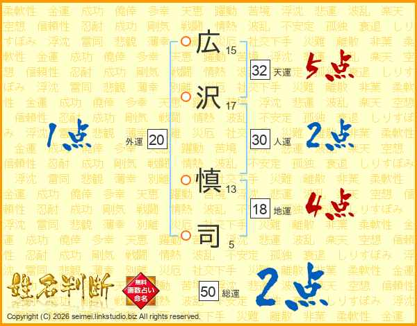 生活面を象徴する運勢です。外部から受ける影響力を表し、結婚運、家庭運や職場、環境への順応性を表します。総運から人運を引いた画数。姓や名が1文字の場合を除く。