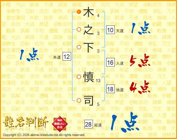 木(4画)之(3画)下(3画) 慎(13画)司(5画)