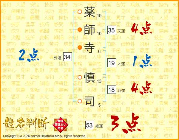 薬(19画)師(10画)寺(6画) 慎(13画)司(5画)