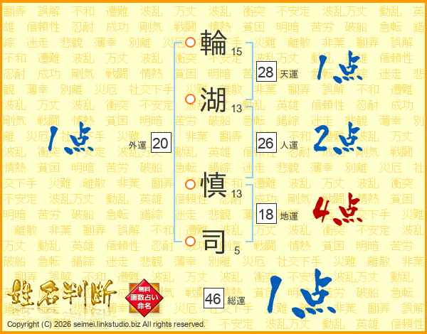 輪(15画)湖(13画) 慎(13画)司(5画)