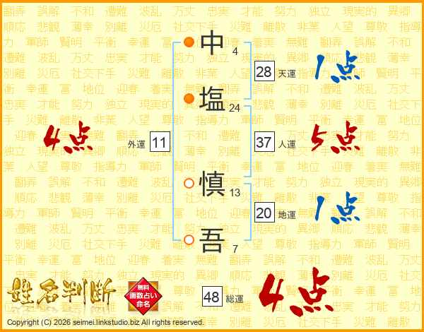 中(4画)塩(24画) 慎(13画)吾(7画)