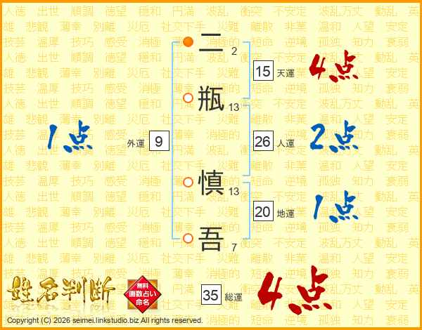生活面を象徴する運勢です。外部から受ける影響力を表し、結婚運、家庭運や職場、環境への順応性を表します。総運から人運を引いた画数。姓や名が1文字の場合を除く。
