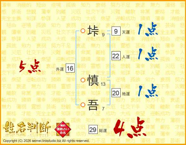 生活面を象徴する運勢です。外部から受ける影響力を表し、結婚運、家庭運や職場、環境への順応性を表します。総運から人運を引いた画数。姓や名が1文字の場合を除く。