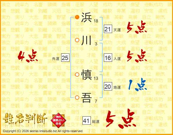 浜(18画)川(3画) 慎(13画)吾(7画)