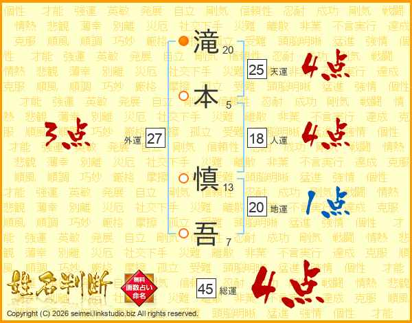 滝(20画)本(5画) 慎(13画)吾(7画)
