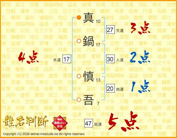真(10画)鍋(17画) 慎(13画)吾(7画)