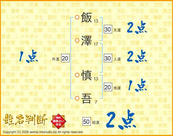 飯(13画)澤(17画) 慎(13画)吾(7画)