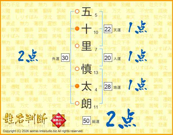 五(5画)十(10画)里(7画) 慎(13画)太(4画)朗(11画)