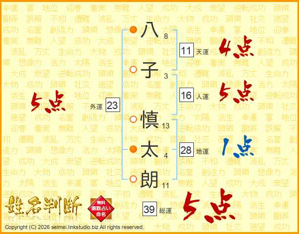 八(8画)子(3画) 慎(13画)太(4画)朗(11画)