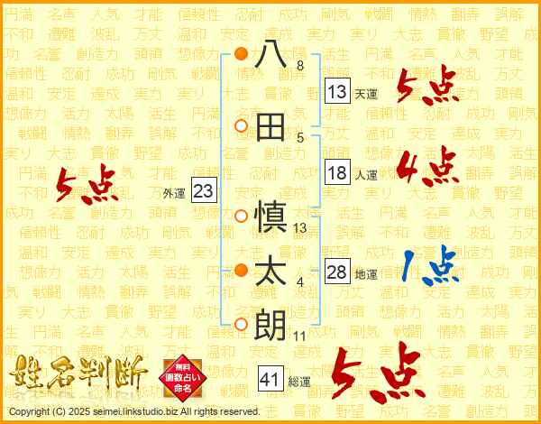 八(8画)田(5画) 慎(13画)太(4画)朗(11画)
