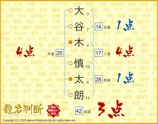 大(3画)谷(7画)木(4画) 慎(13画)太(4画)朗(11画)