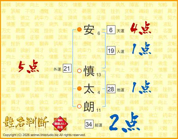 安(6画) 慎(13画)太(4画)朗(11画)