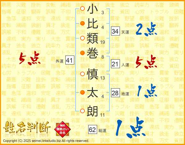 小(3画)比(4画)類(19画)巻(8画) 慎(13画)太(4画)朗(11画)
