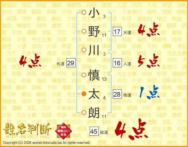 小(3画)野(11画)川(3画) 慎(13画)太(4画)朗(11画)