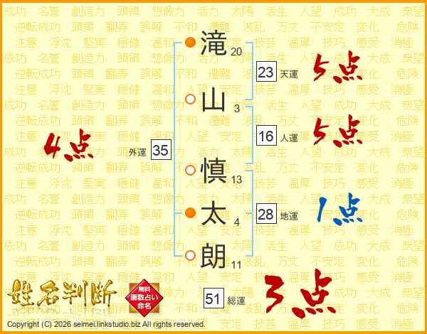 滝(20画)山(3画) 慎(13画)太(4画)朗(11画)