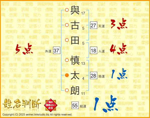 與(17画)古(5画)田(5画) 慎(13画)太(4画)朗(11画)