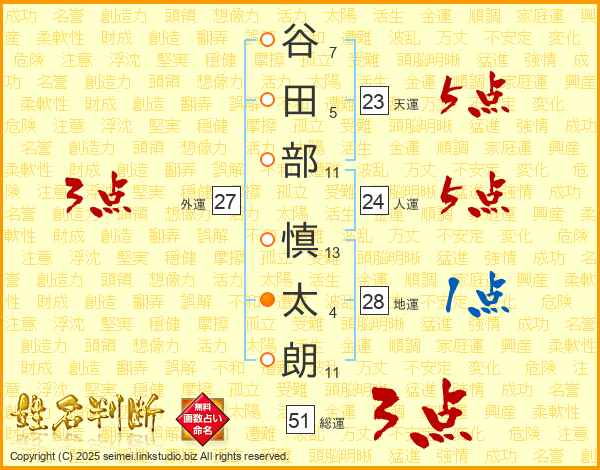 谷(7画)田(5画)部(11画) 慎(13画)太(4画)朗(11画)