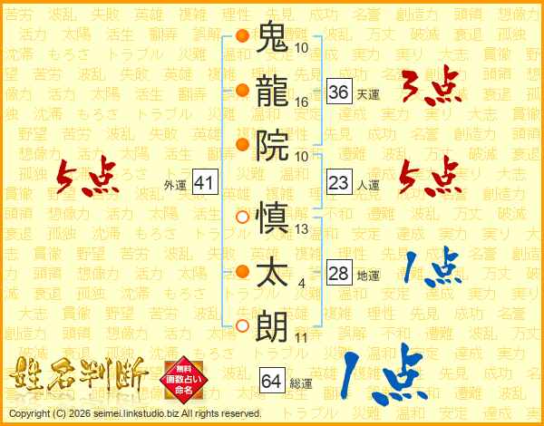 鬼(10画)龍(16画)院(10画) 慎(13画)太(4画)朗(11画)