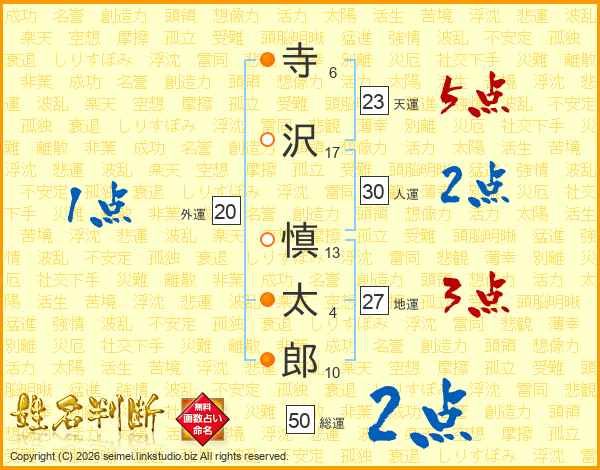 寺(6画)沢(17画) 慎(13画)太(4画)郎(10画)