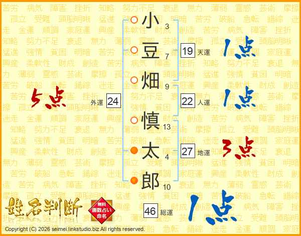 小(3画)豆(7画)畑(9画) 慎(13画)太(4画)郎(10画)