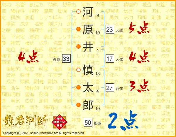 河(9画)原(10画)井(4画) 慎(13画)太(4画)郎(10画)