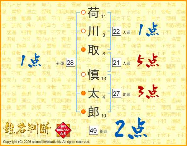 荷(11画)川(3画)取(8画) 慎(13画)太(4画)郎(10画)