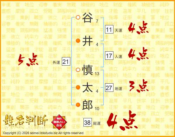 谷(7画)井(4画) 慎(13画)太(4画)郎(10画)