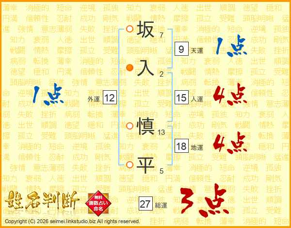 坂(7画)入(2画) 慎(13画)平(5画)