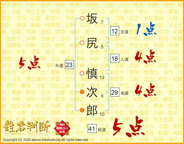 坂(7画)尻(5画) 慎(13画)次(6画)郎(10画)