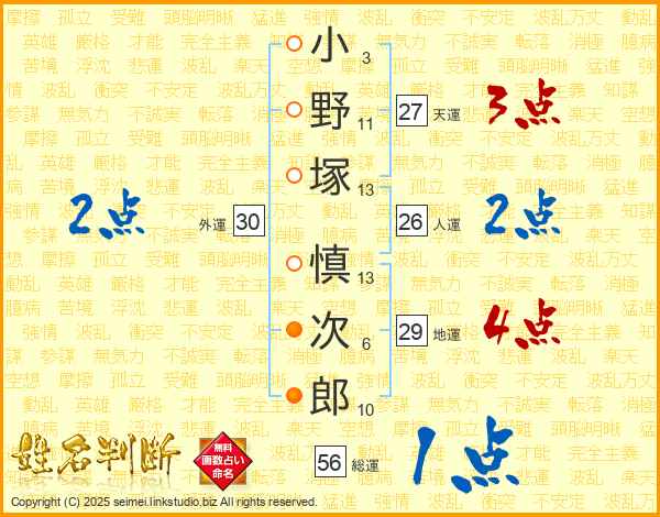 小(3画)野(11画)塚(13画) 慎(13画)次(6画)郎(10画)