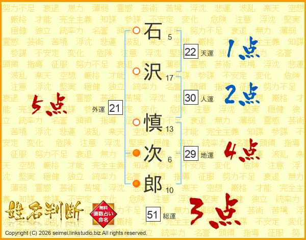 石(5画)沢(17画) 慎(13画)次(6画)郎(10画)