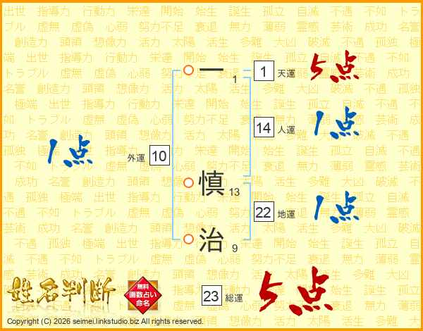生活面を象徴する運勢です。外部から受ける影響力を表し、結婚運、家庭運や職場、環境への順応性を表します。総運から人運を引いた画数。姓や名が1文字の場合を除く。