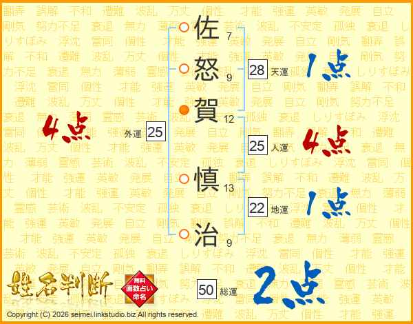 佐怒賀慎治さんの人運は25画の4点!