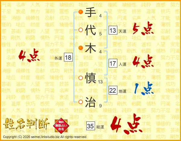 手(4画)代(5画)木(4画) 慎(13画)治(9画)