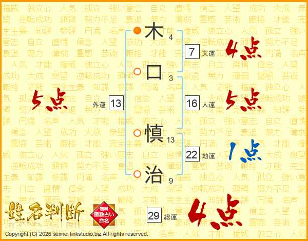 木(4画)口(3画) 慎(13画)治(9画)