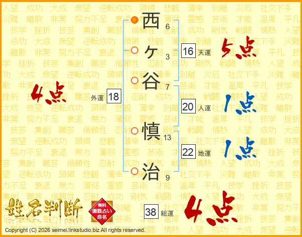 西(6画)ヶ(3画)谷(7画) 慎(13画)治(9画)