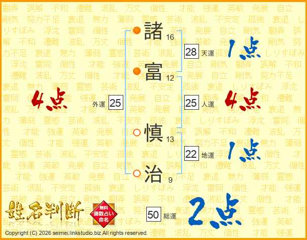 生活面を象徴する運勢です。外部から受ける影響力を表し、結婚運、家庭運や職場、環境への順応性を表します。総運から人運を引いた画数。姓や名が1文字の場合を除く。