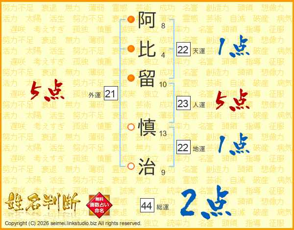 生活面を象徴する運勢です。外部から受ける影響力を表し、結婚運、家庭運や職場、環境への順応性を表します。総運から人運を引いた画数。姓や名が1文字の場合を除く。